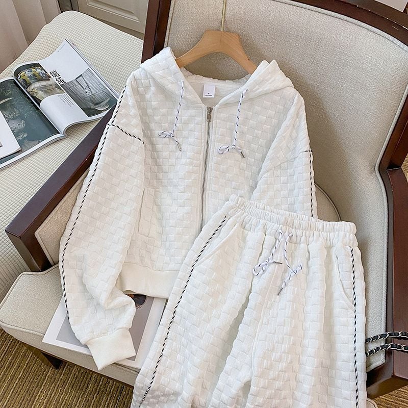 このセットアップはホワイトカラーがおしゃれで目を引く一着。大きめのサイズとフード付きのパーカーとパンツがセットになっており、カジュアルでスポーティなスタイルを演出します。ジャージ素材で、着心地も抜群です。
