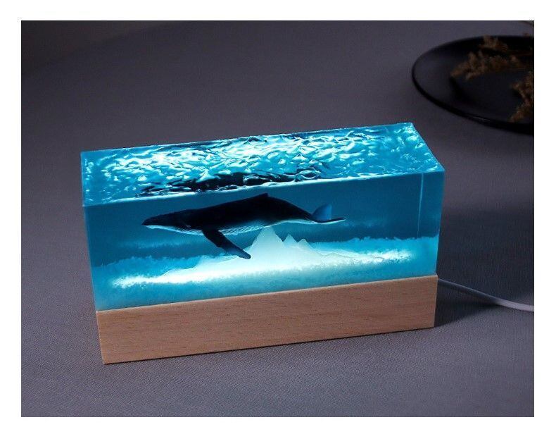 ザトウクジラ フィギュア LEDライト USBケーブル 木製台座 付き セット エポキシ樹脂 レジン クラフト コンセント スイッチ ON/OFF 青い 光 海 海底砂 オブジェ ベッドサイド ナイト ランプ リビング 寝室 プレゼント
