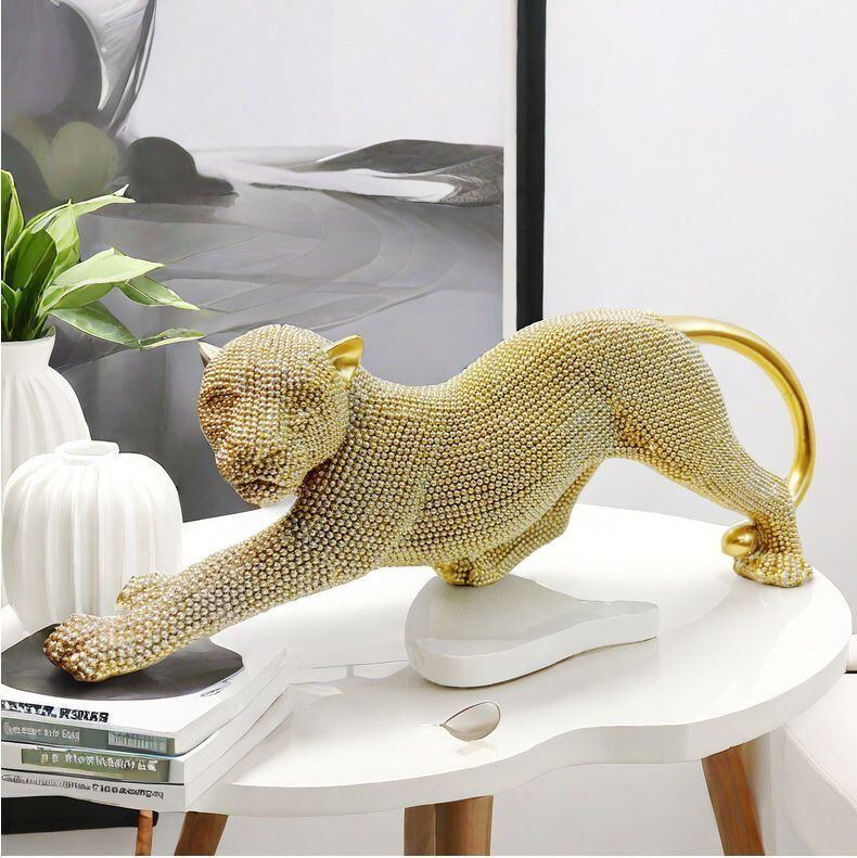 豹 フィギュア 樹脂ビーズ キラキラ 置物 ゴールド 手作り パンサー レオパード 俊敏 強い 速い 鋭い かっこいい 野生 リアル オブジェ インテリア 装飾 おしゃれ 卓上 リビング オフィス 金 滑り止め付き